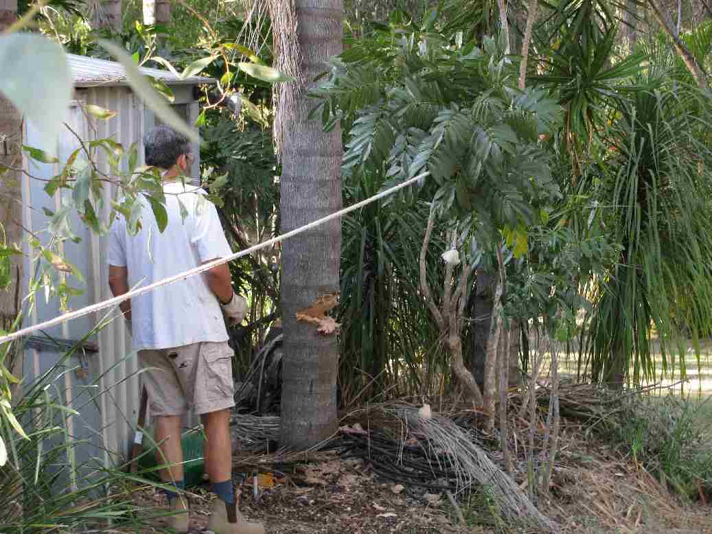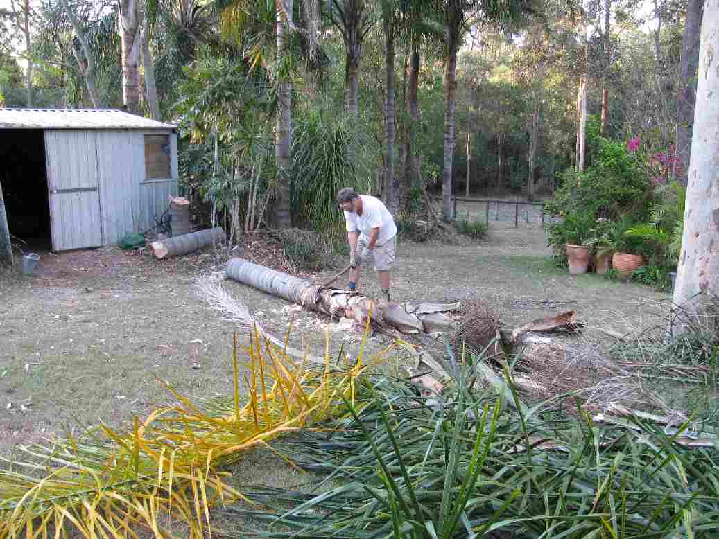 Geoff Choping down Palm near Shed