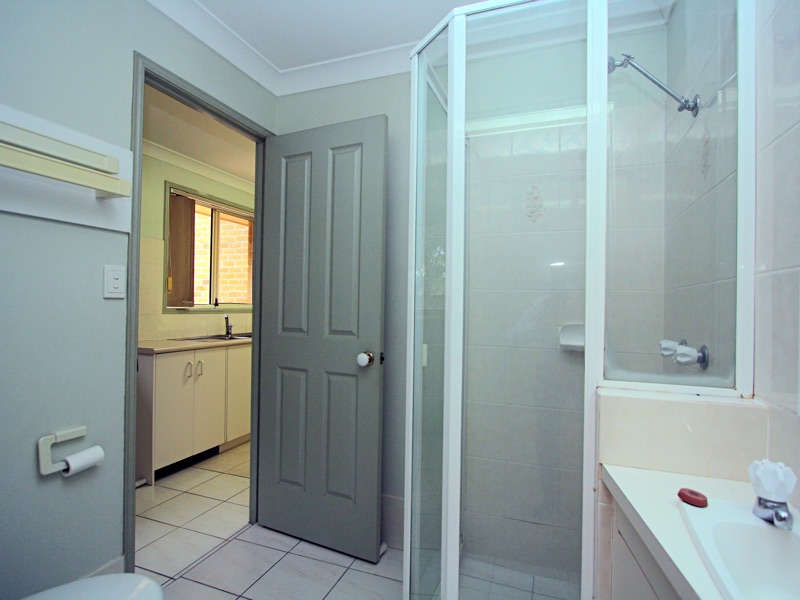 The upstairs bathroom is located between the two upstairs bedrooms with a separate entrance from the main bedroom. There is a separate toilet: