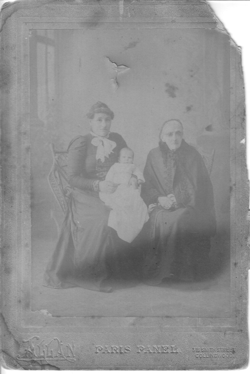 This is our Great Grandmother Mosley, previously Budge. The Baby is our Grandmother Lillian. Their is contention as to who the older lady on the right is. I (Geoff) feel she would be Grandma Mosley's Mother where as Aunty Gwen reckons see is Grandma Mosleys Sister.