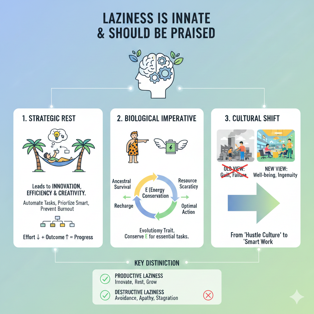 • Well-being and Avoiding Burnout: Chronic overwork and the glorification of “hustle culture” lead to stress, burnout, and reduced long-term productivity. “Laziness,” in this context, can be interpreted as self-preservation—a refusal to exhaust oneself unnecessarily, thus ensuring sustainability.